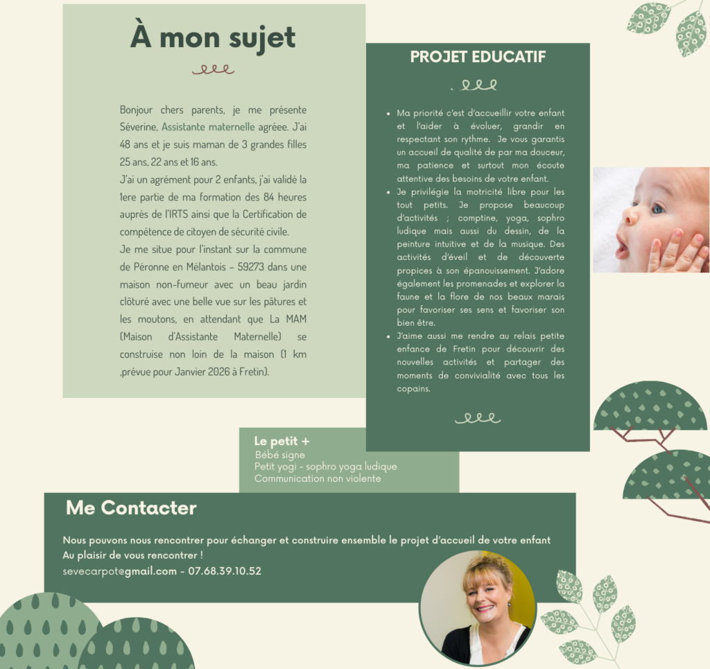 Avant d'être assistante maternelle, j'ai été éducatrice spécialisée et animatrice petite enfance. J'ai diverses expériences en structure spécialisée, en crèche, micro crèche ainsi qu'en garde à domicile.